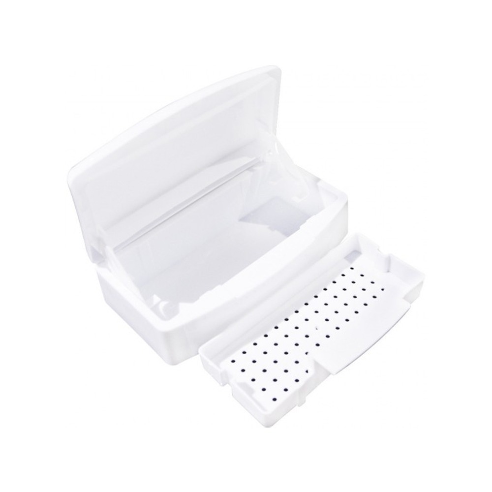 Бокс для дезінфекції та стерилізації манікюрного / педикюрного інструменту і фрезерних насадок. Рухомий лоток забезпечує повне занурення інструменту в дезінфікуючі розчини, а при відкритті кришки дозволяє рідині стекти в піддон.